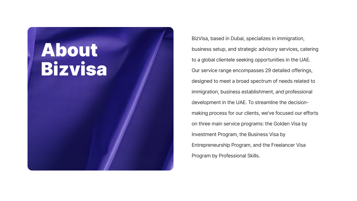 BizVisa is a Dubai-based immigration and business advisory brand serving a global audience seeking opportunities in the UAE. The brand specializes in immigration, business setup, and strategic advisory services, offering a wide range of solutions that are streamlined into three core programs: the Golden Visa by Investment Program, the Business Visa by Entrepreneurship Program, and the Freelancer Visa Program by Professional Skills. The branding was designed to reflect trust, clarity, and long-term vision—key qualities essential for clients making life-changing decisions.