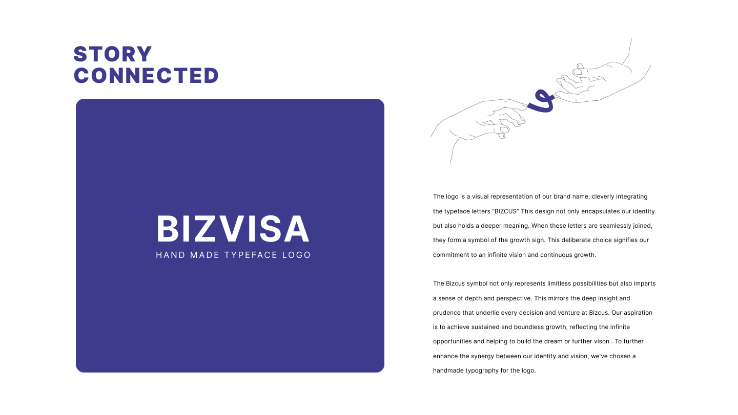 The logo concept is a visual interpretation of the brand’s ambition and philosophy. Built around the brand name Bizcus, the custom typography integrates the letterforms in a seamless, continuous structure. When combined, these forms subtly create a growth symbol, representing progress, upward movement, and infinite potential. This intentional design choice reflects the brand’s commitment to continuous growth and forward momentum. The symbol also introduces depth and perspective, mirroring the insight, foresight, and strategic thinking that guide every BizVisa engagement. To strengthen authenticity and distinction, a handmade typographic approach was chosen—giving the logo a human, confident, and trustworthy character while reinforcing the brand’s vision of building futures and unlocking limitless opportunities.